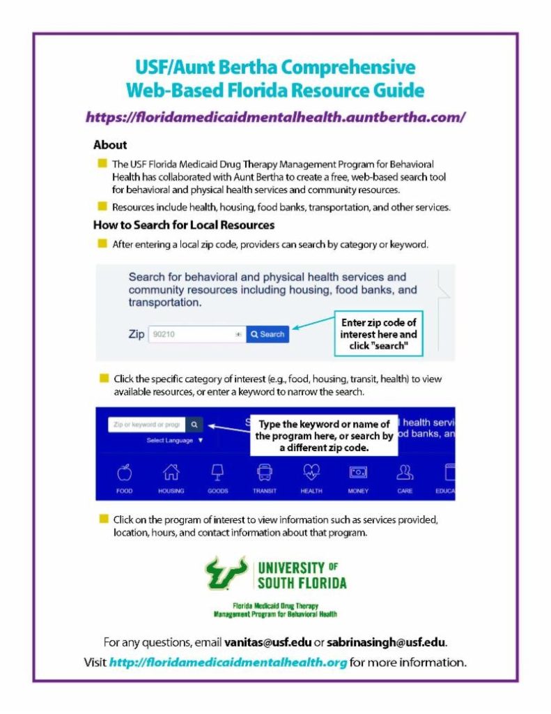 The Florida Medicaid Drug Therapy Management (DTM) Program for Behavioral Health is pleased to announce a free web-based resource guide featuring reduced cost social and medical services available to Florida communities. Resources include assistance with housing, transportation, food, and access to behavioral and physical healthcare services. Please take some time to use this resource and provide us with any feedback or thoughts on your experience navigating the resource guide. For information on the web-based resource guide, see the information below. To search resources through the web-based resource guide, visit https://floridamedicaidmentalhealth.auntbertha.com To view more information about the DTM Program, visit http://floridamedicaidmentalhealth.org. For any questions about the web-based resource guide, email Vanita Sahasranaman, MD at vanitas@usf.edu or Sabrina Singh, MPH at sabrinasingh@usf.edu.
